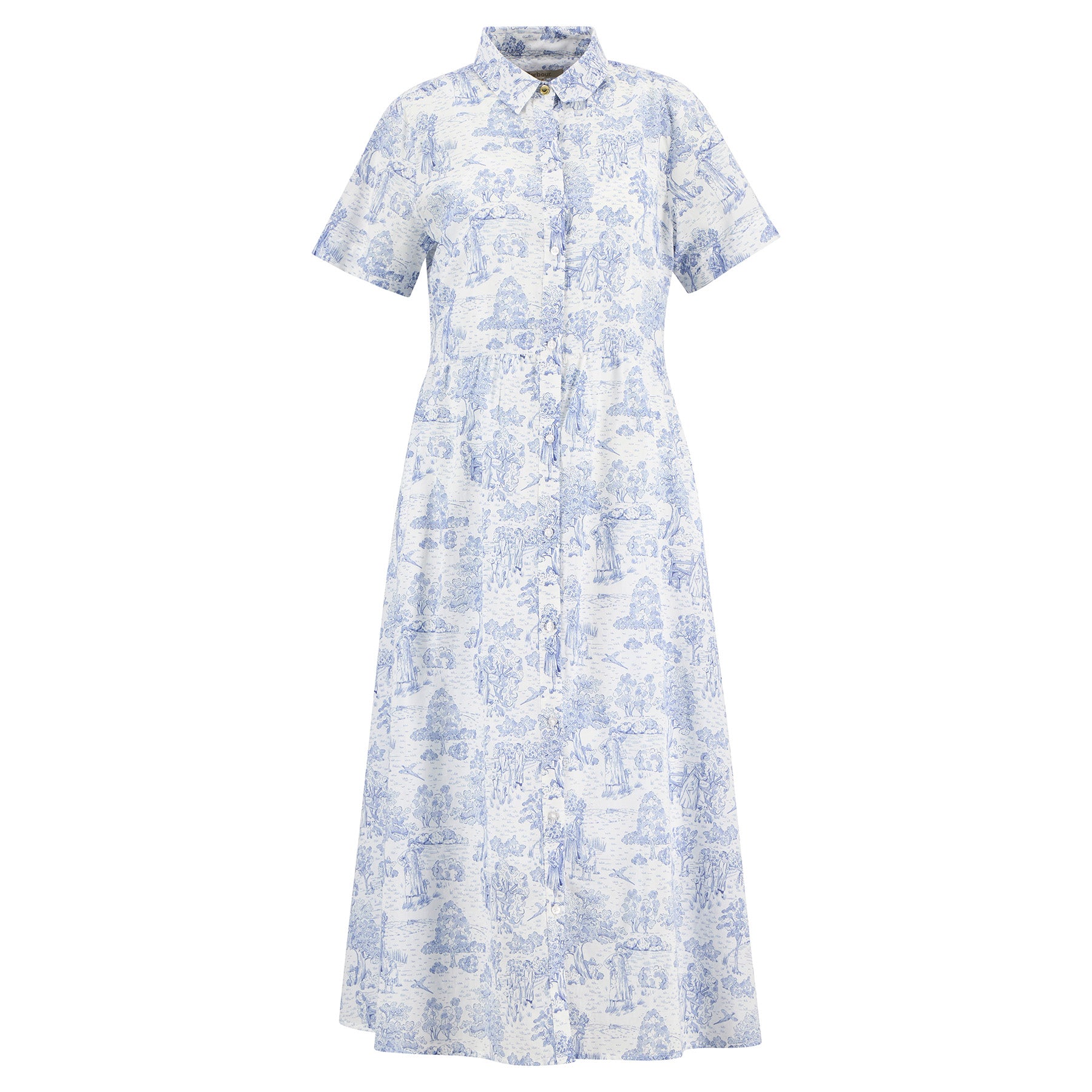 The Barbour Wisteria Midi Dress is a relaxed fit style crafted from 100% lightweight cotton in a delicate toile de jour print. Featuring a brand brass shank button at the top neck, branded imitation mother-of-pearl buttons along the front placket and cuffs and an ID bar at the back neck, it offers timeless Barbour detailing in a feminine silhouette.