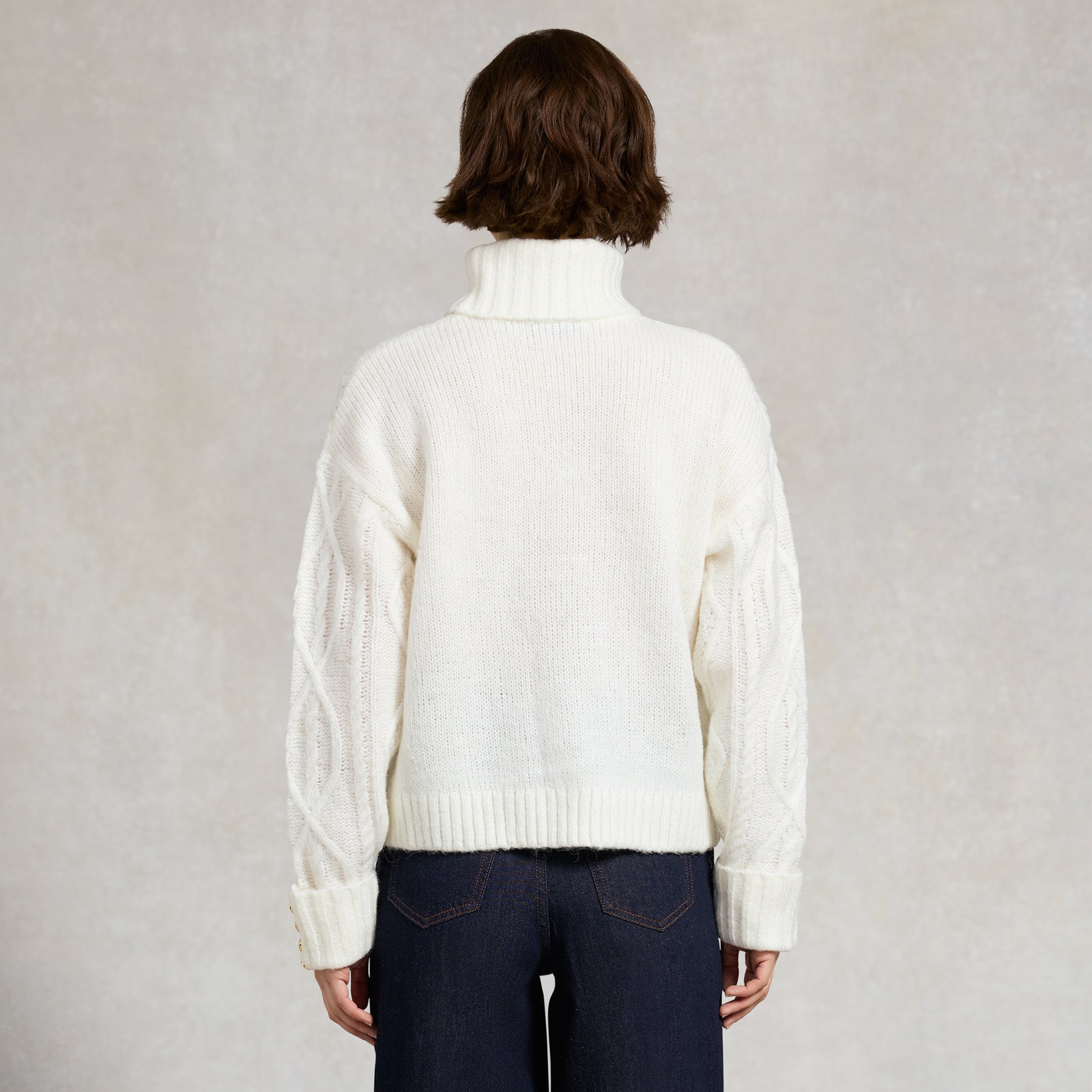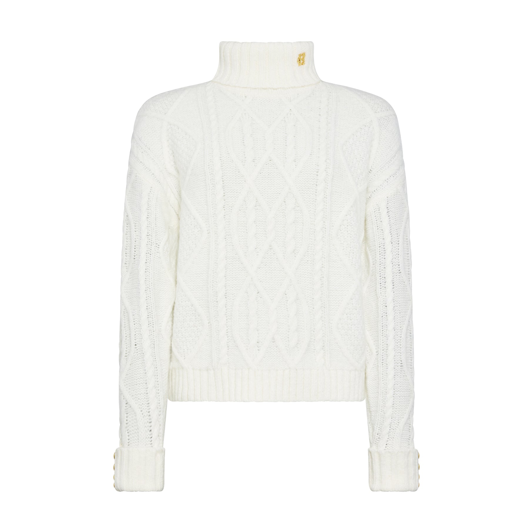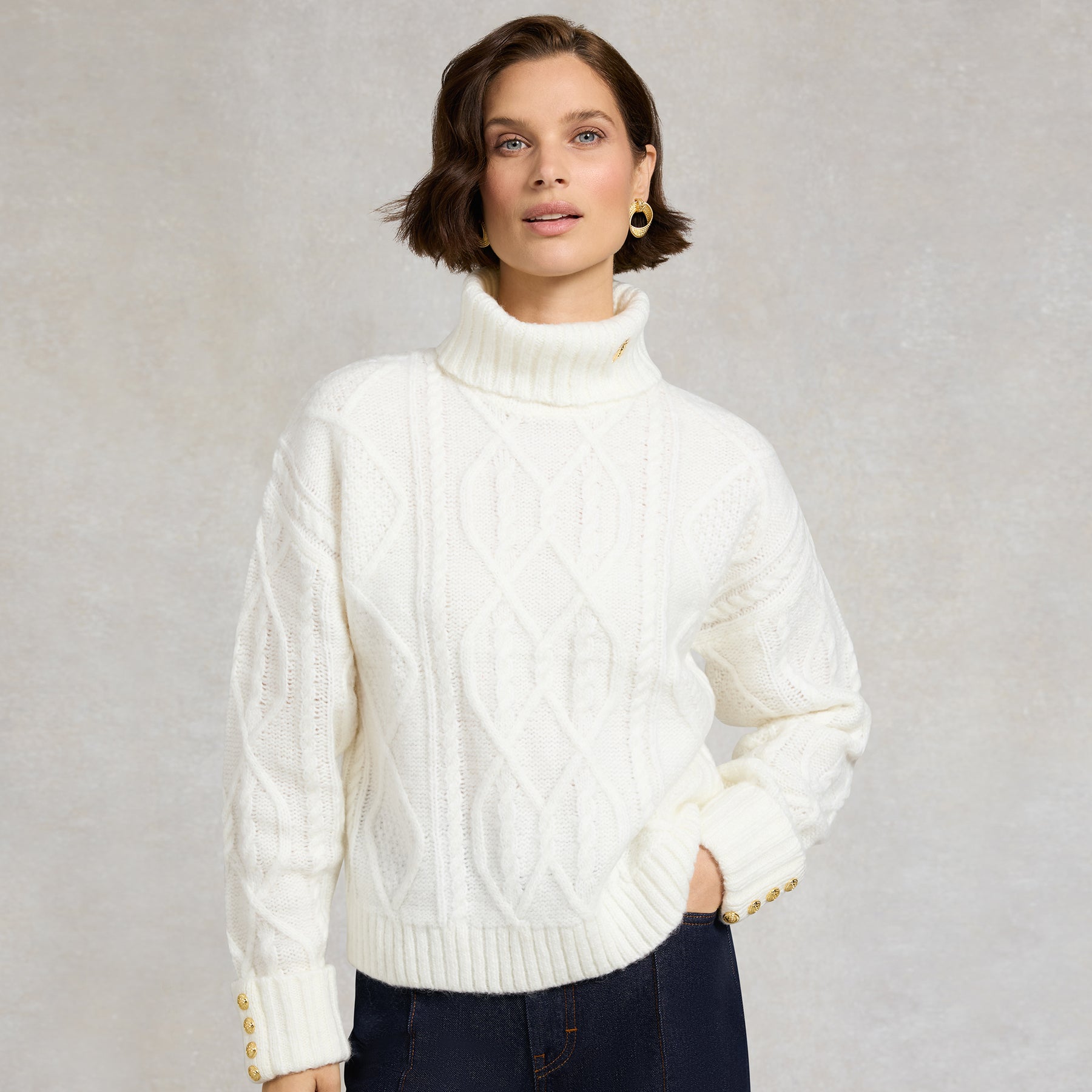Crafted from a sumptuously soft yarn, newly enriched with subtle multi-tonal hues for added depth, this knit features a modern cable design for texture and interest. The boxy fit and drop shoulders create a contemporary, relaxed silhouette, while signature gold rivets on the cuffs and HC hardware at the collar add refined finishing touches. Elevated for the season, this versatile piece brings a sophisticated update to your knitwear collection.