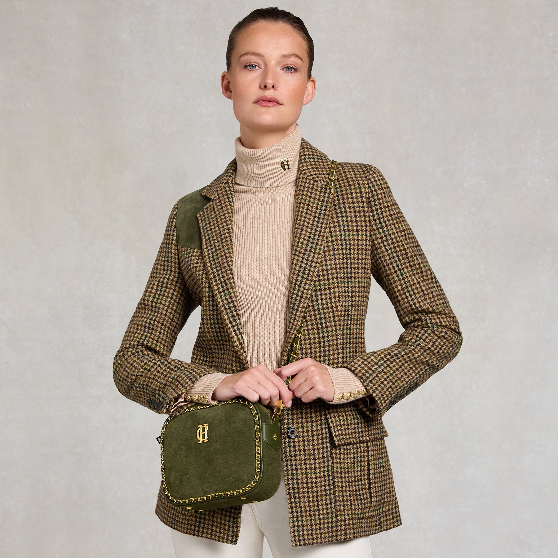 - Warm gold hardware